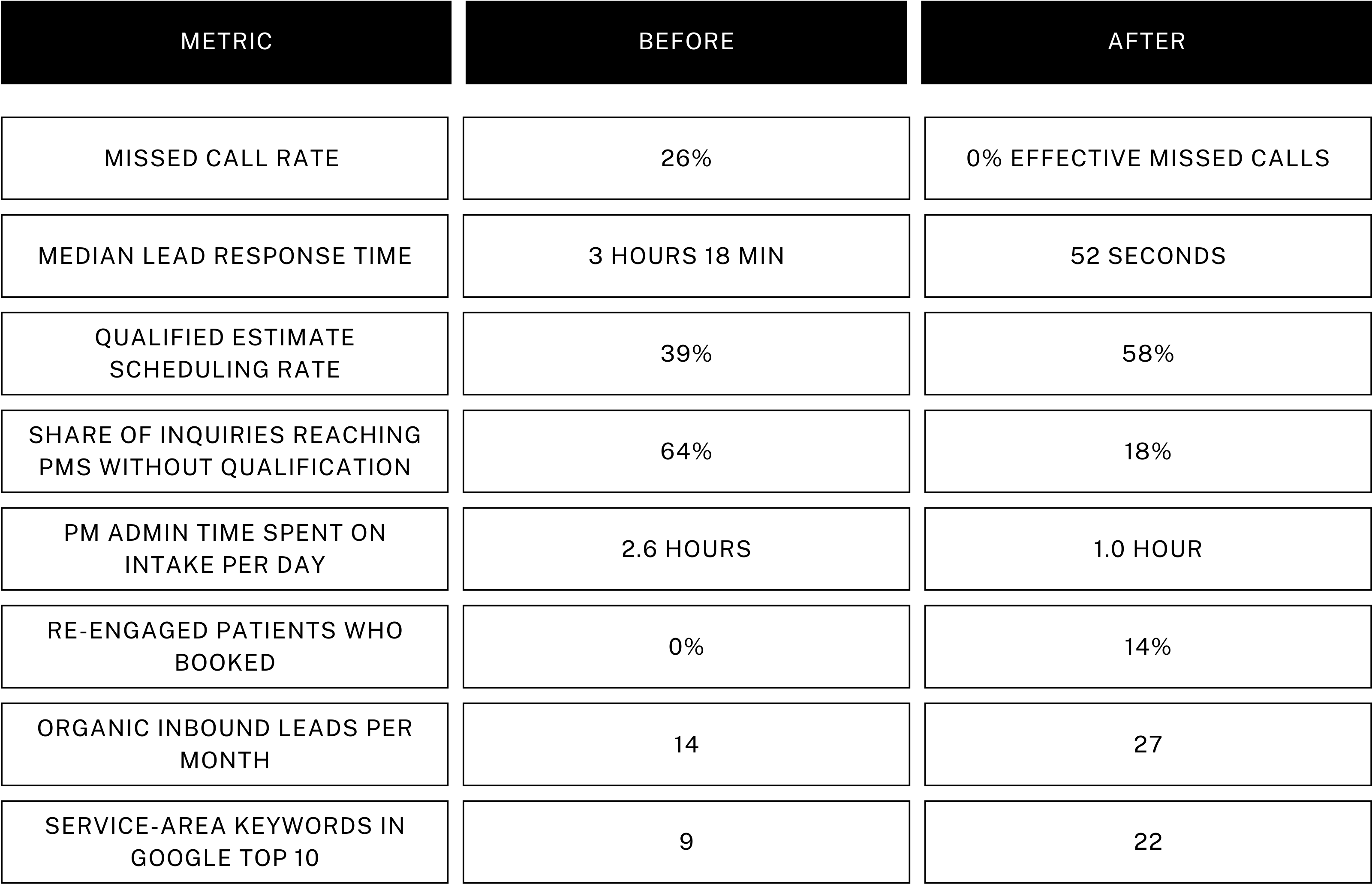 Inbound AI Receptionist, Bid Intake Automation, Pipeline Dashboard, SEO + AI SEO