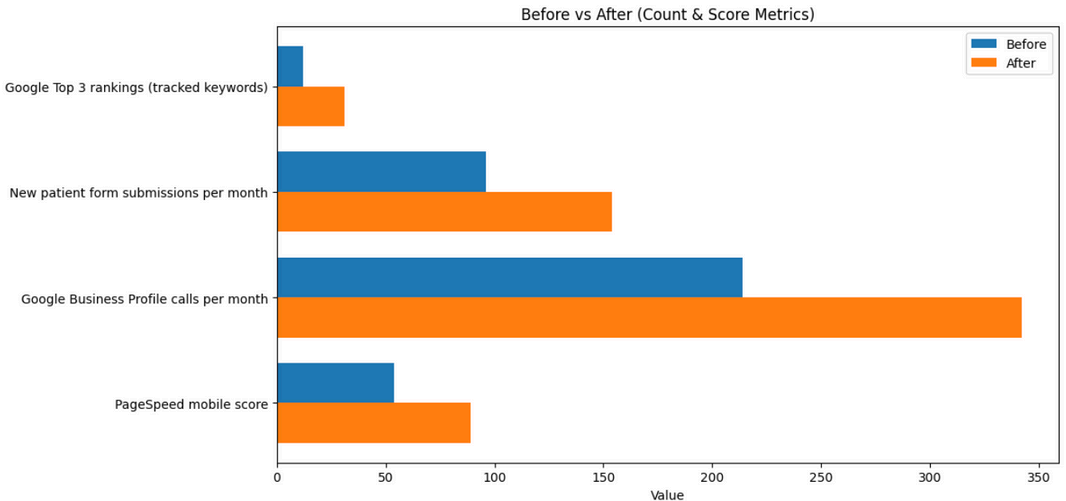 - Custom dashboard (organic + GBP + calls + forms + bookings)