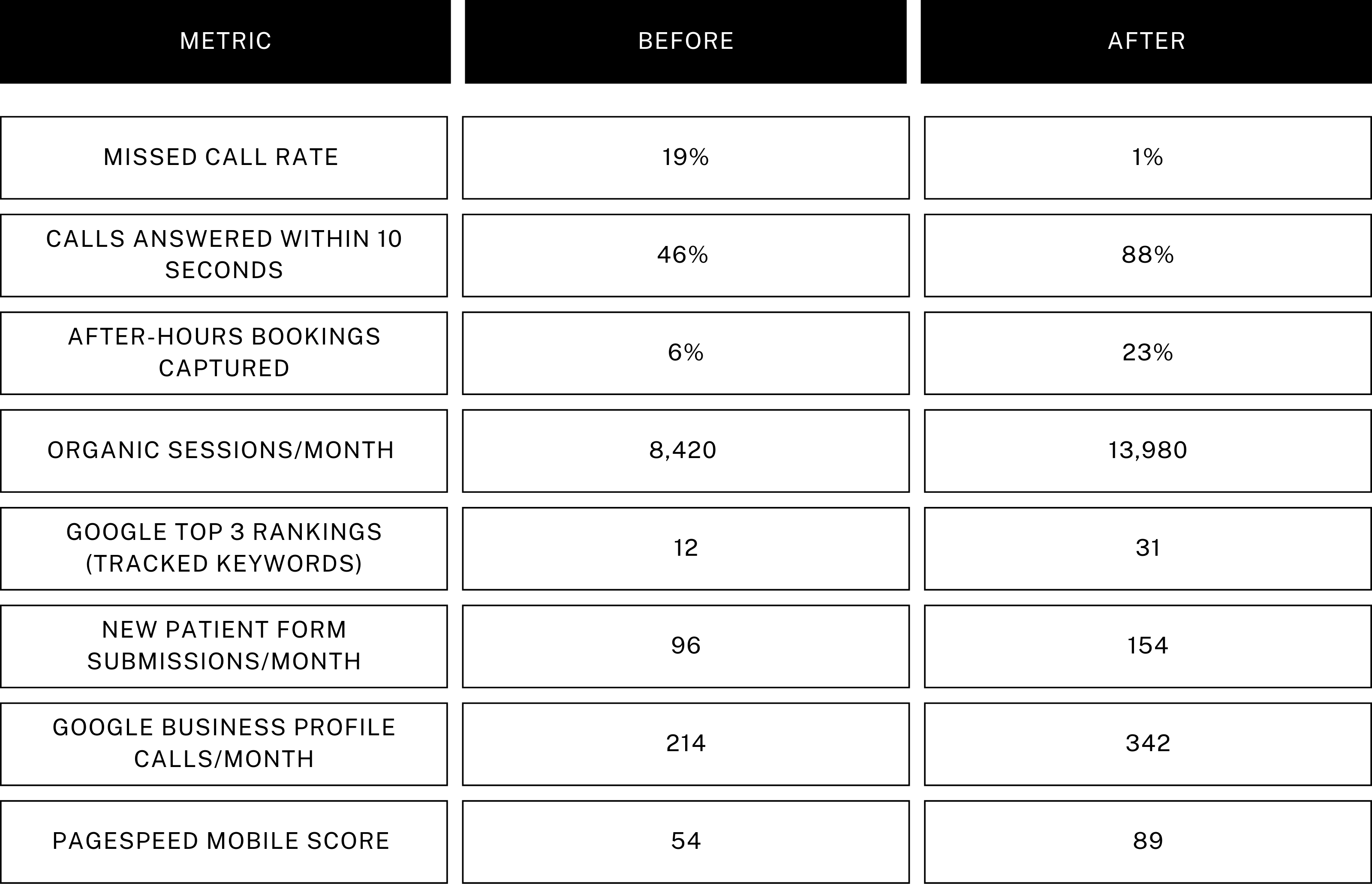 St. Moritz Dental wanted predictable new patient acquisition through organic search while reducing missed calls and improving booking performance. They wanted a full system that connected traffic → inquiries → booked patients.